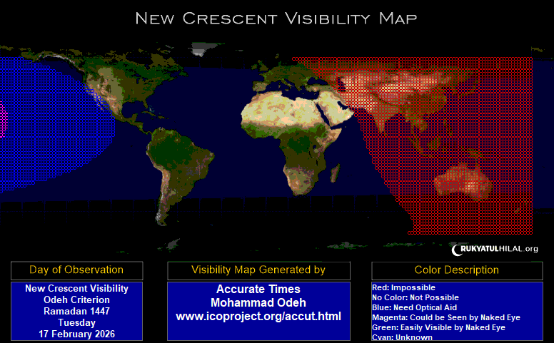 Berdasarkan data astronomis ketinggian dan elongasi hilal kali ini untuk seluruh kawasan Indonesia terutama titik paling Barat Indonesia yaitu kota Sabang serta berdasarkan Peta Global Visibilitas Hilal pada hari pelaksanaan rukyat, mengacu pada Kriteria MABIMS-364 maka Taqwin Standard Indonesia dan Sidang Isbat menetapkan awal Ramadhan 1447 H jatuh pada Kamis, 19 Februari 2026 berdasarkan istikmal.