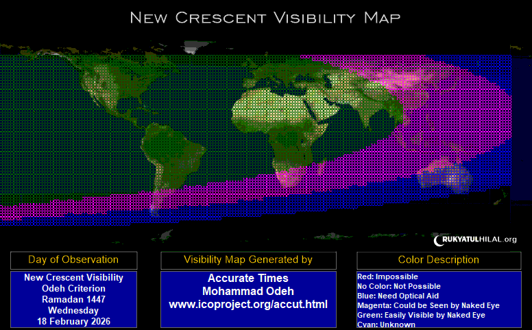 Visibilitas Hilal pada hari pelaksanaan rukyat di Indonesia saat Matahari terbenam di seluruh dunia yang ditunjukkan pada gambar peta visibilitas di atas yang mengacu pada Kriteria Visibilitas Hilal Odeh (2005) berdasarkan software Accurate Times baik pada hari saat konjungsi maupun sebelumnya.