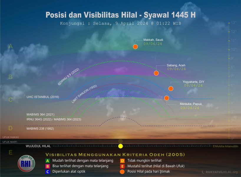 - D adalah wilayah hilal tidak mungkin dapat dilihat walaupun menggunakan alat bantu optik, hilal masih dibawah limit Danjon.